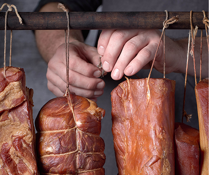 Każda kiełbasa, kaszanka powstają w naturalnych jelitach i są ręcznie nadziewane, odwijane oraz osuszane. Każda wędzonka, czy pieczyste jest ręcznie wiązane przędzą. To pracochłonna metoda, ale dzięki niej, każdy kawałek mięsa przechodzi przez nasze ręce, produkty oddychają, lepiej przyjmują dym i zachowują idealną strukturę.