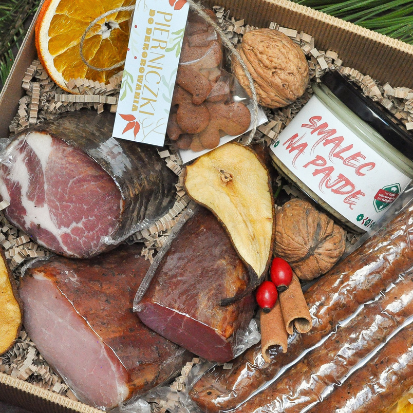 - Elegancki zestaw prezentowy w drewnianej skrzynce z selekcją wędlin dojrzewających, polędwicy z dzika, tradycyjnego smalcu oraz słodkich dodatków: orzechów w miodzie i pierniczków.